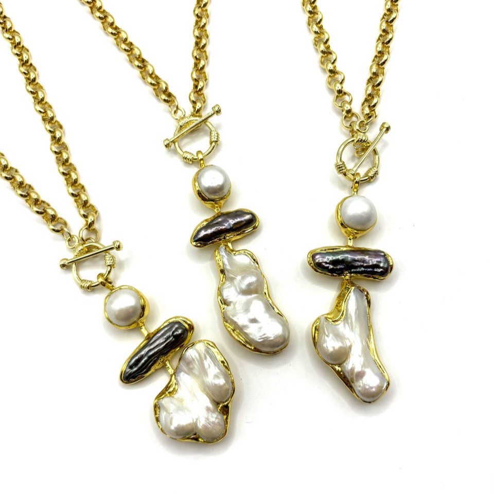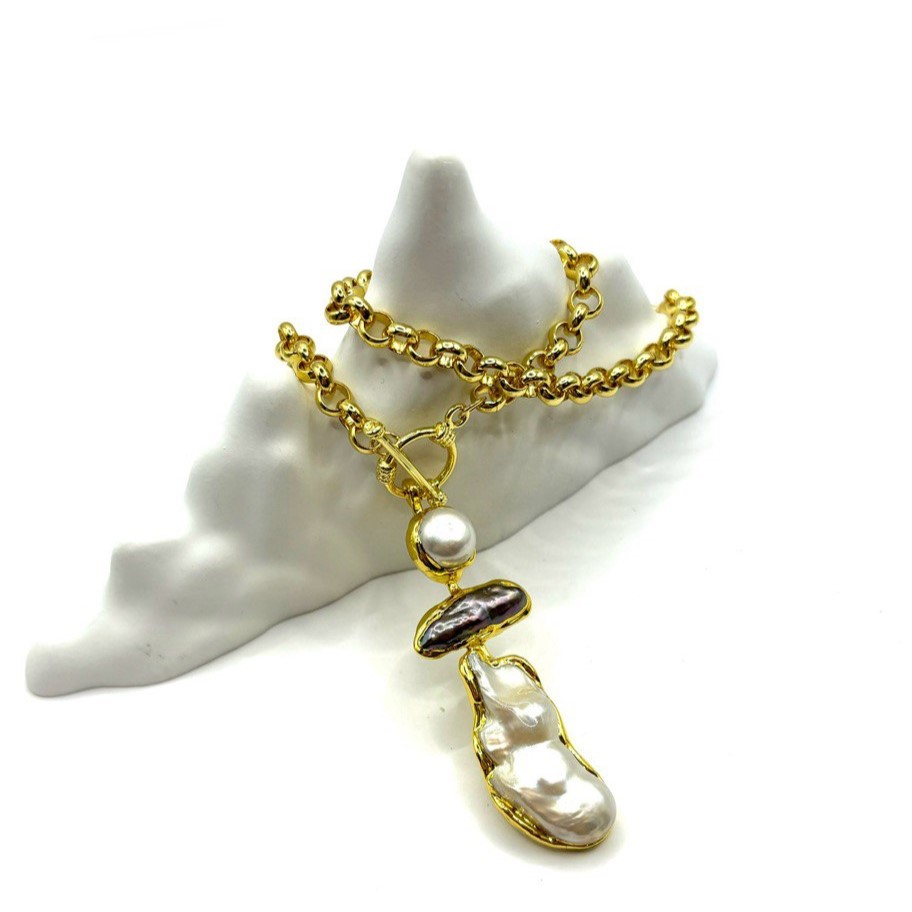 Колье с крупным барочным жемчугом создаёт элегантное впечатление благодаря сочетанию природной неровной формы жемчужин и мягких перламутровых бликов. Фиолетовые и золотистые детали добавляют выразительности, сохраняя благородный характер украшения. Колье гармонично дополнит как романтические, так и вечерние образы. Замок-тогл из высококачественного бижутерного сплава надёжен и удобен.
