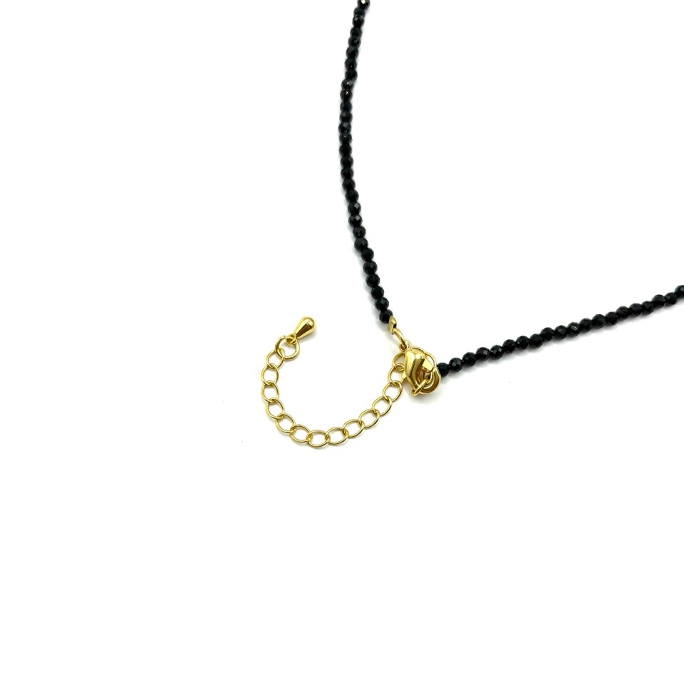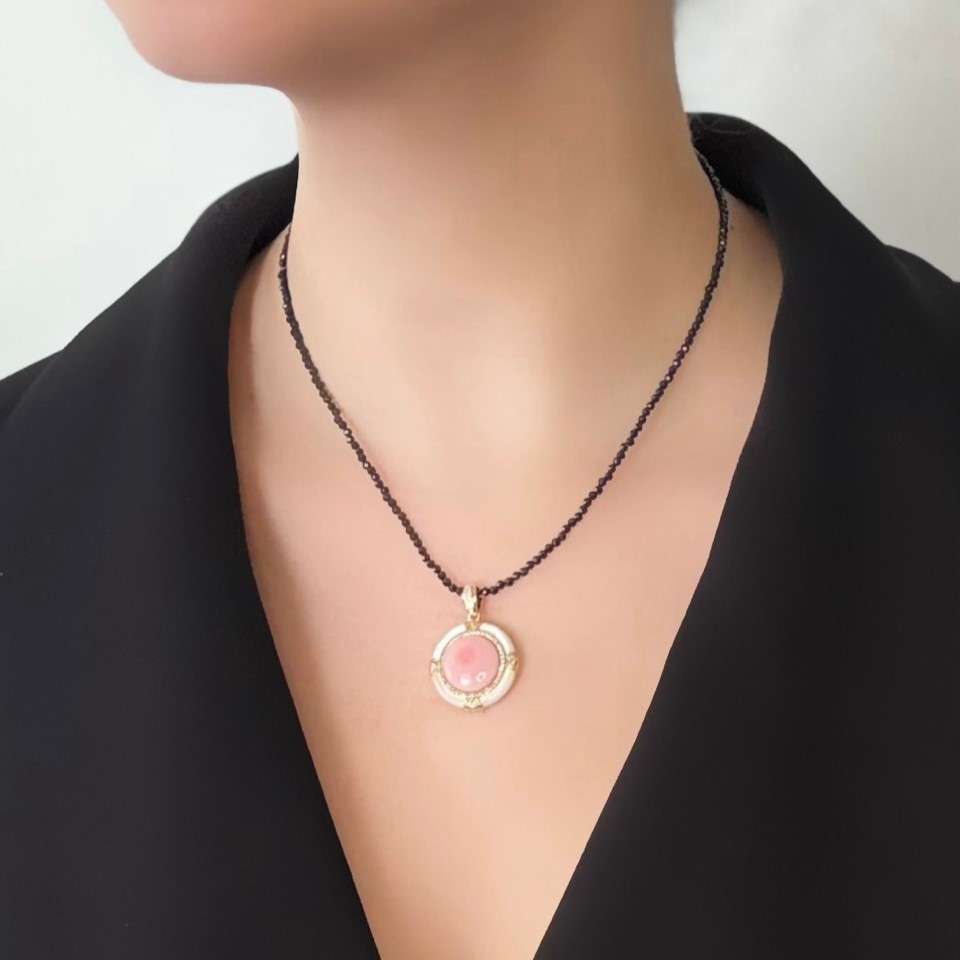 Колье с подвеской из розового и белого перламутра и чокером из шпинели сочетает нежные переливы натурального перламутра и блеск чёрной шпинели, создавая выразительный и женственный акцент. Камни красиво отражают свет, а позолоченный высококачественный сплав обеспечивает долговечность. Карабин-замок удобен и надёжно фиксирует изделие, позволяя носить колье каждый день с комфортом.
