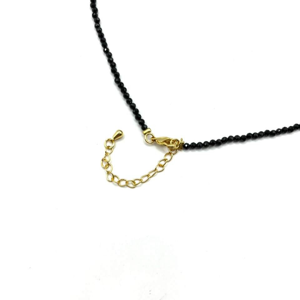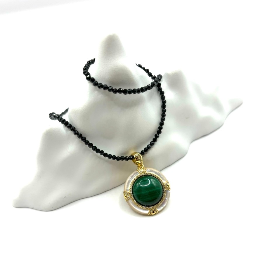 Колье с подвеской из малахита и перламутра на чокере из шпинели выделяется насыщенной природной палитрой: глубокий зелёный малахит, сияющий перламутр и блеск мелкой шпинели создают сложный, дорогой визуальный эффект. Высококачественный позолоченный сплав делает украшение долговечным. Карабин удобно застёгивается и надёжно удерживает колье, позволяя ему комфортно сидеть на шее.