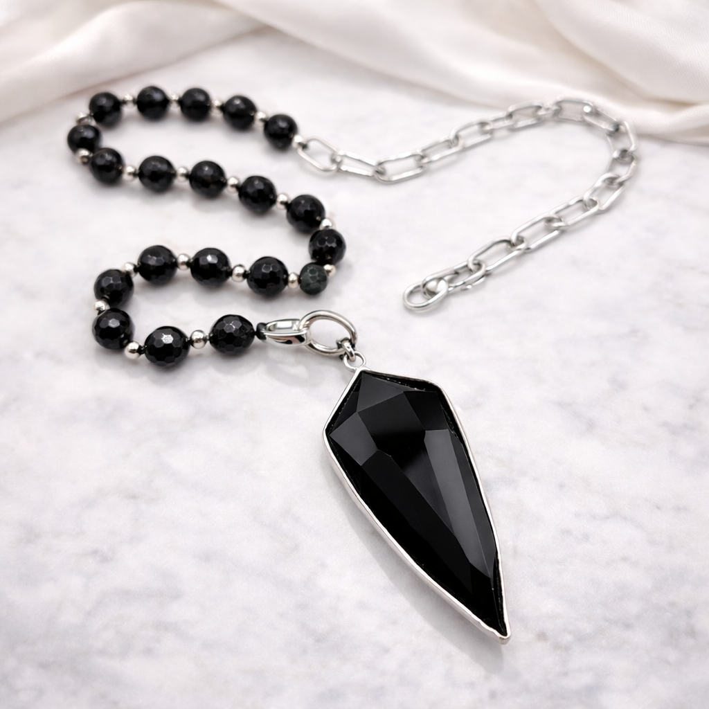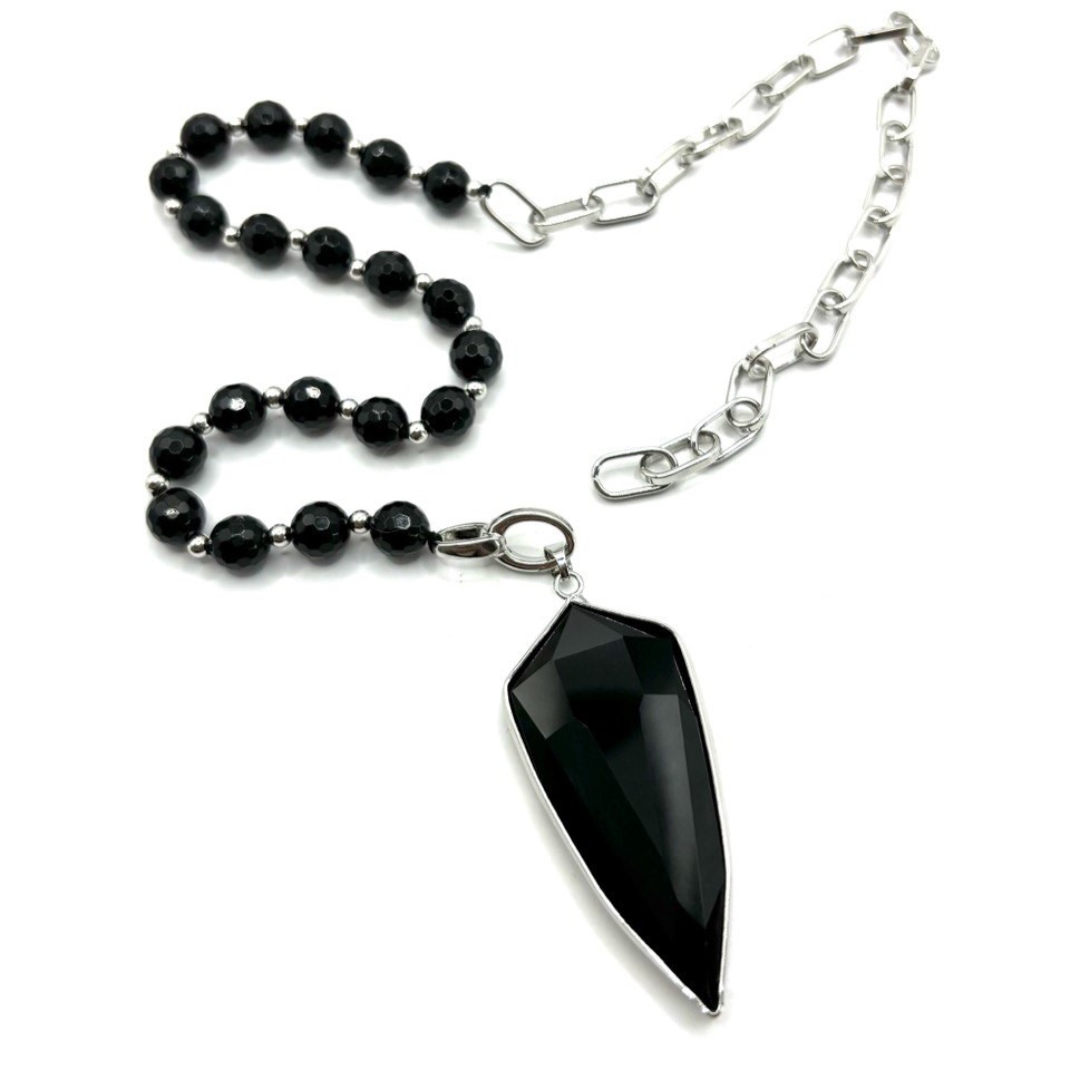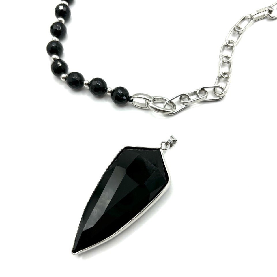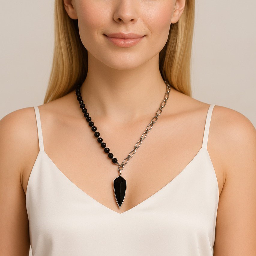 Колье с агатом на массивной асимметричной цепи сочетает гладкий блеск натурального агата и динамику массивных звеньев, создавая смелый акцент в образе. Высококачественный сплав гарантирует долговечность и комфорт при носке. Карабин-замок удобен и надёжен. Такое колье легко становится центральной деталью и подчёркивает уверенный, современный стиль. Подвеска съемная и позволяет поиграть со стилем