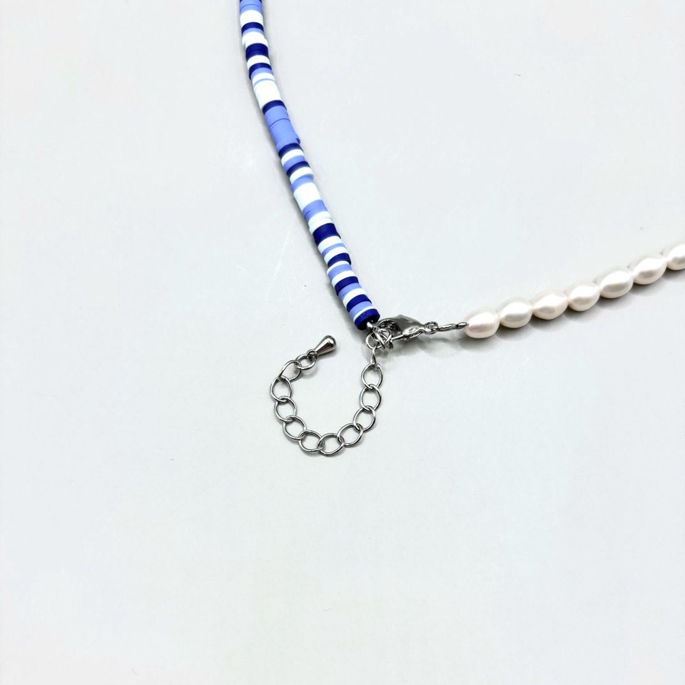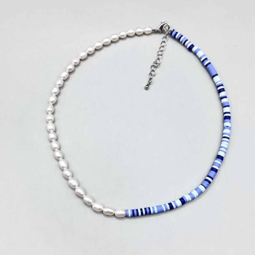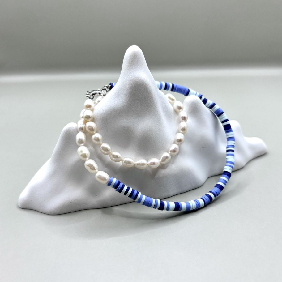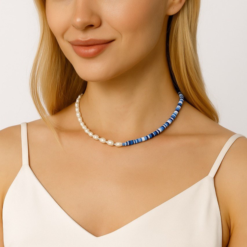Колье с речным жемчугом и голубым каучуком смотрится выразительно и современно. Нежный блеск жемчуга подчёркивается чистым оттенком каучука, создавая приятный визуальный контраст. Сплав высокого качества гарантирует долговечность, а карабин обеспечивает надёжность. Колье легко становится акцентом в повседневном стиле.