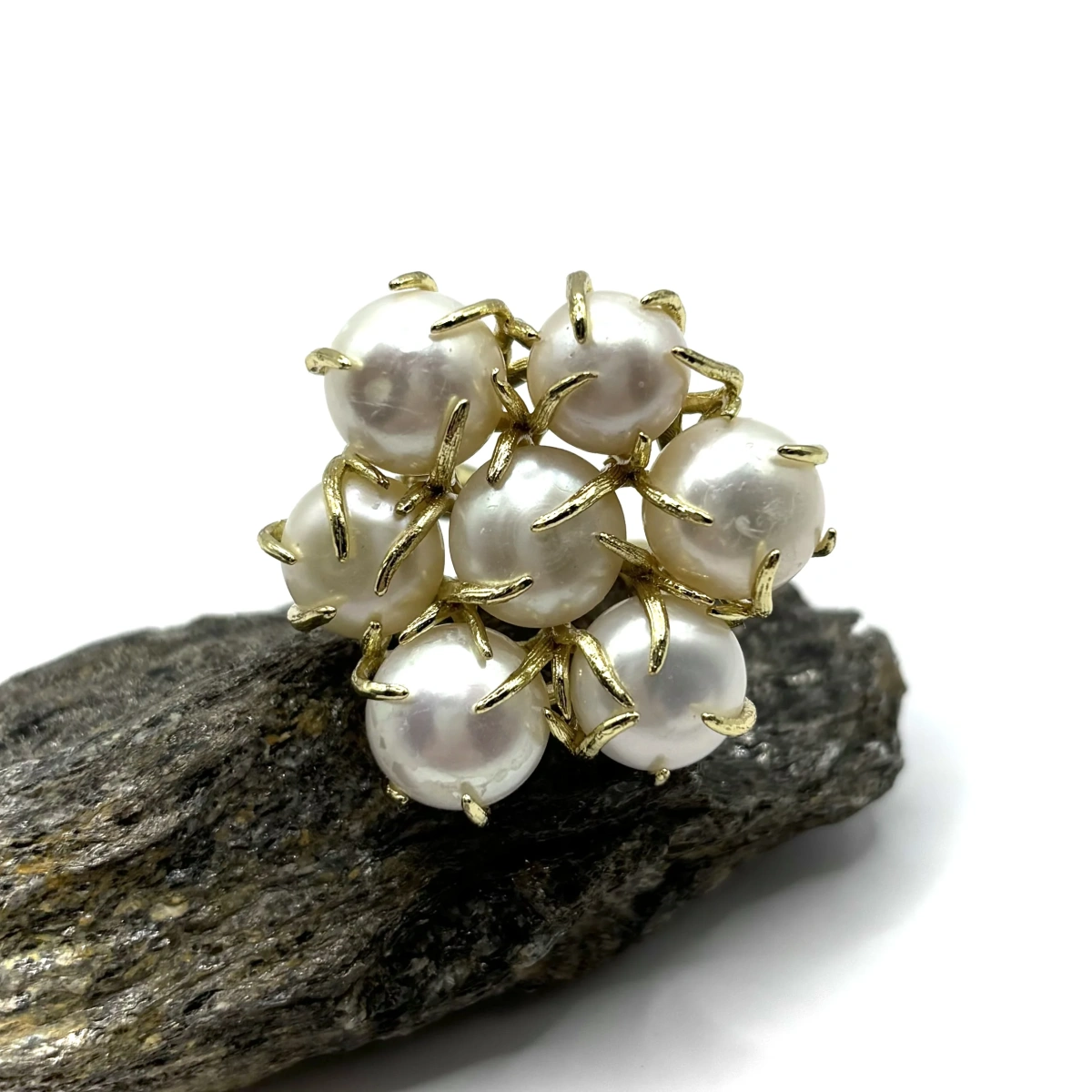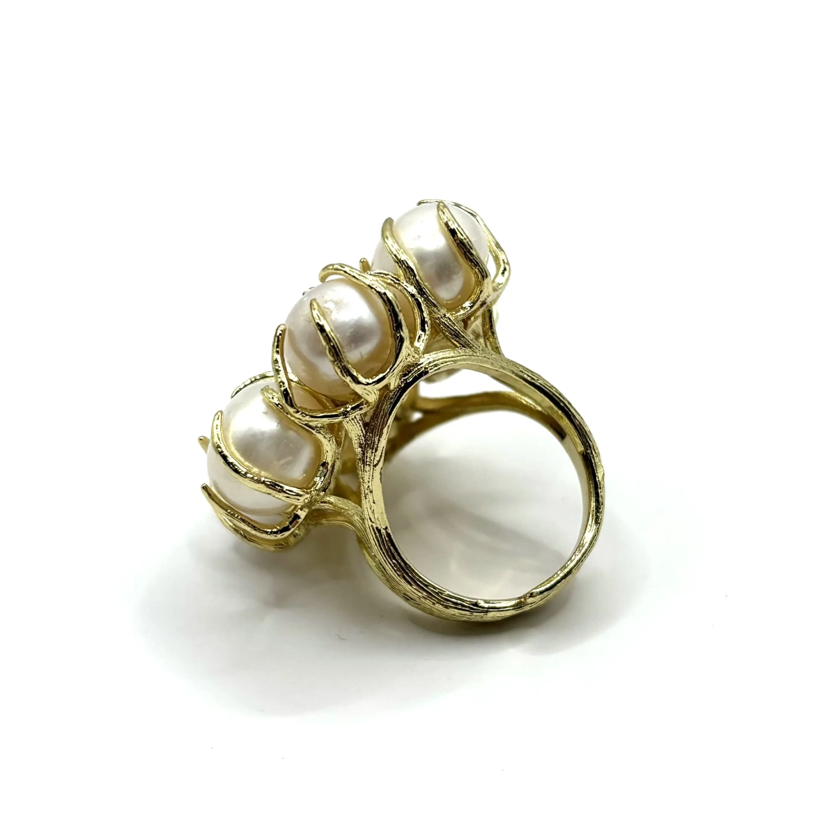 Кольцо собрано из нескольких жемчужин, которые образуют объёмную композицию. За счёт этого оно смотрится как акцент — его сразу видно на руке. Жемчуг барочный, с естественной формой, поэтому каждая жемчужина немного отличается. В этом и есть его особенность — украшение не выглядит «идеально одинаковым», наоборот, в нём есть живая фактура и характер. Позолота добавляет тепла и делает кольцо более выразительным.
