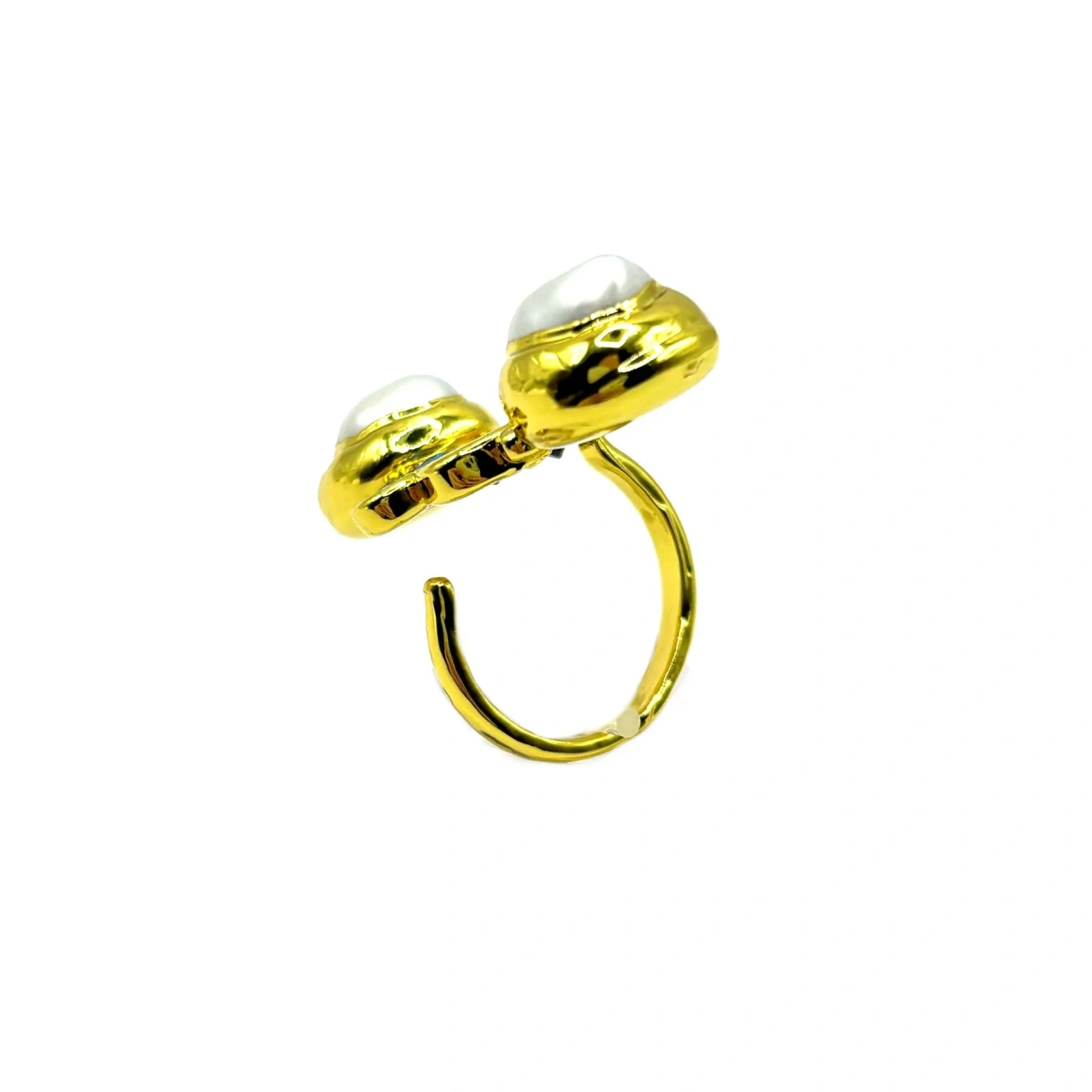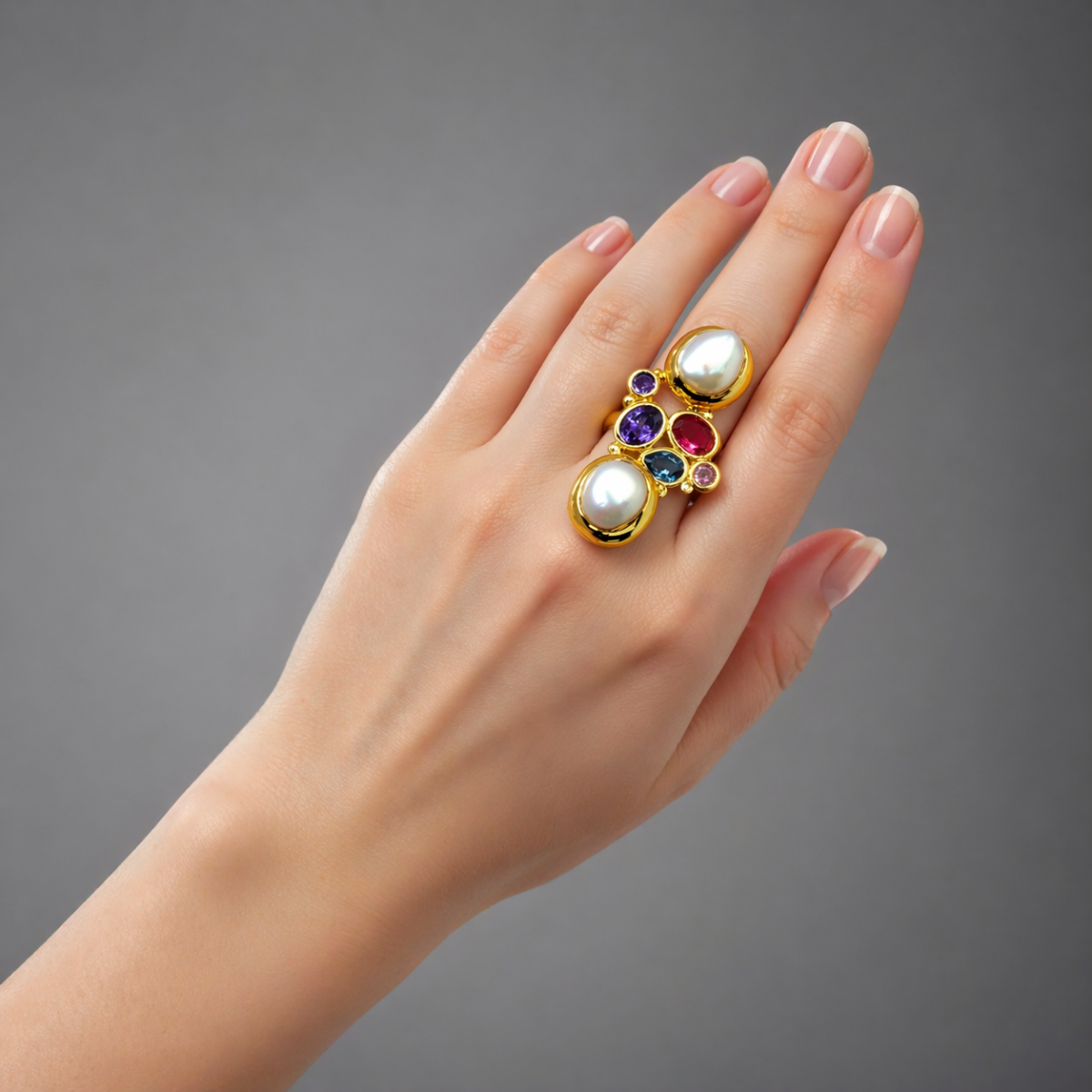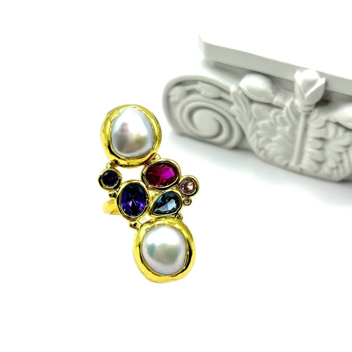 В этом кольце сочетаются две разные текстуры: мягкий барочный жемчуг и сверкающие фианиты. За счёт этого украшение выглядит живо и интересно — оно переливается при движении и ловит свет с разных сторон.