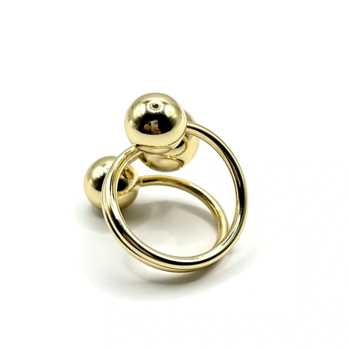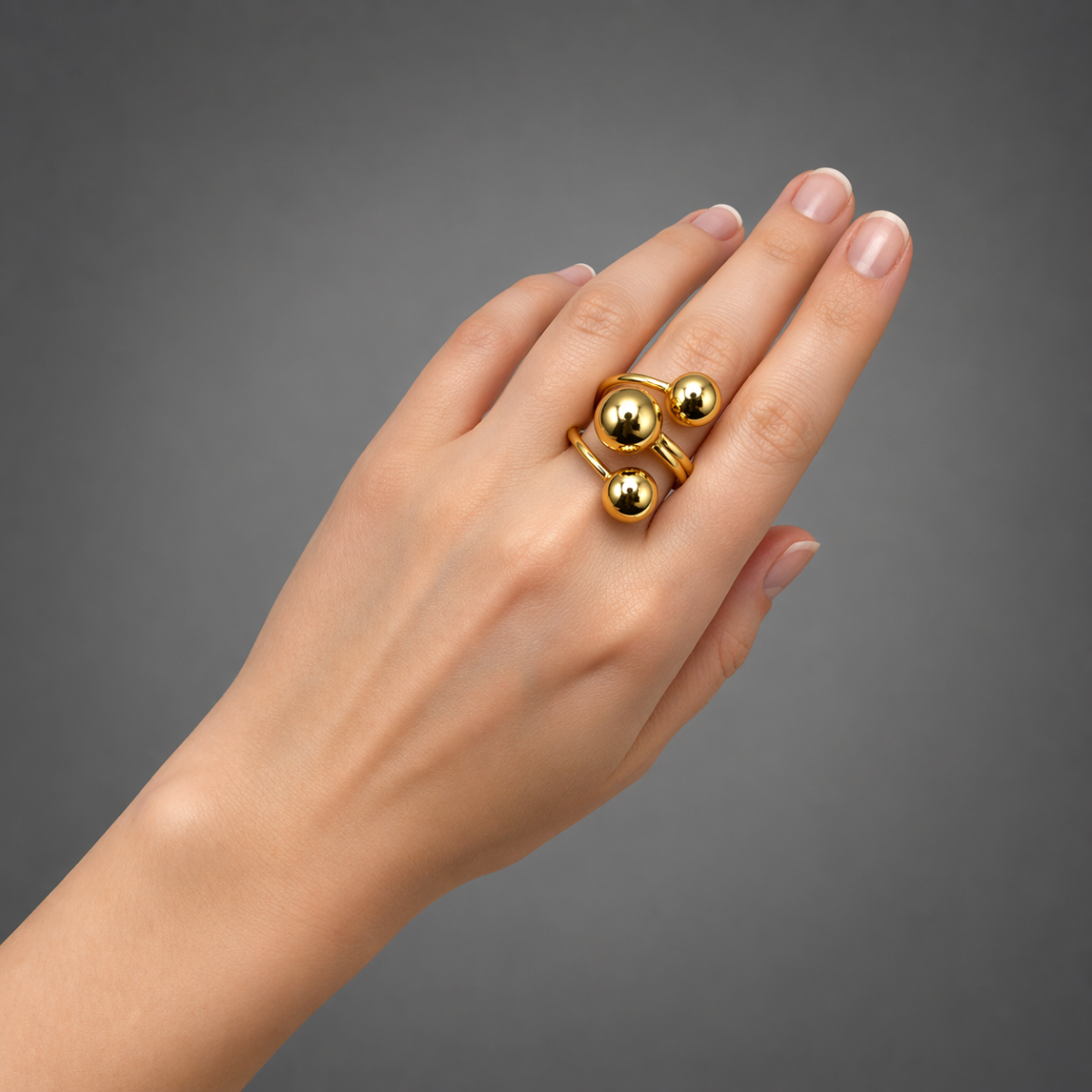Это кольцо — более выразительная версия минимализма. Три гладких шарика создают объём и делают украшение заметным, но при этом оно остаётся лаконичным.