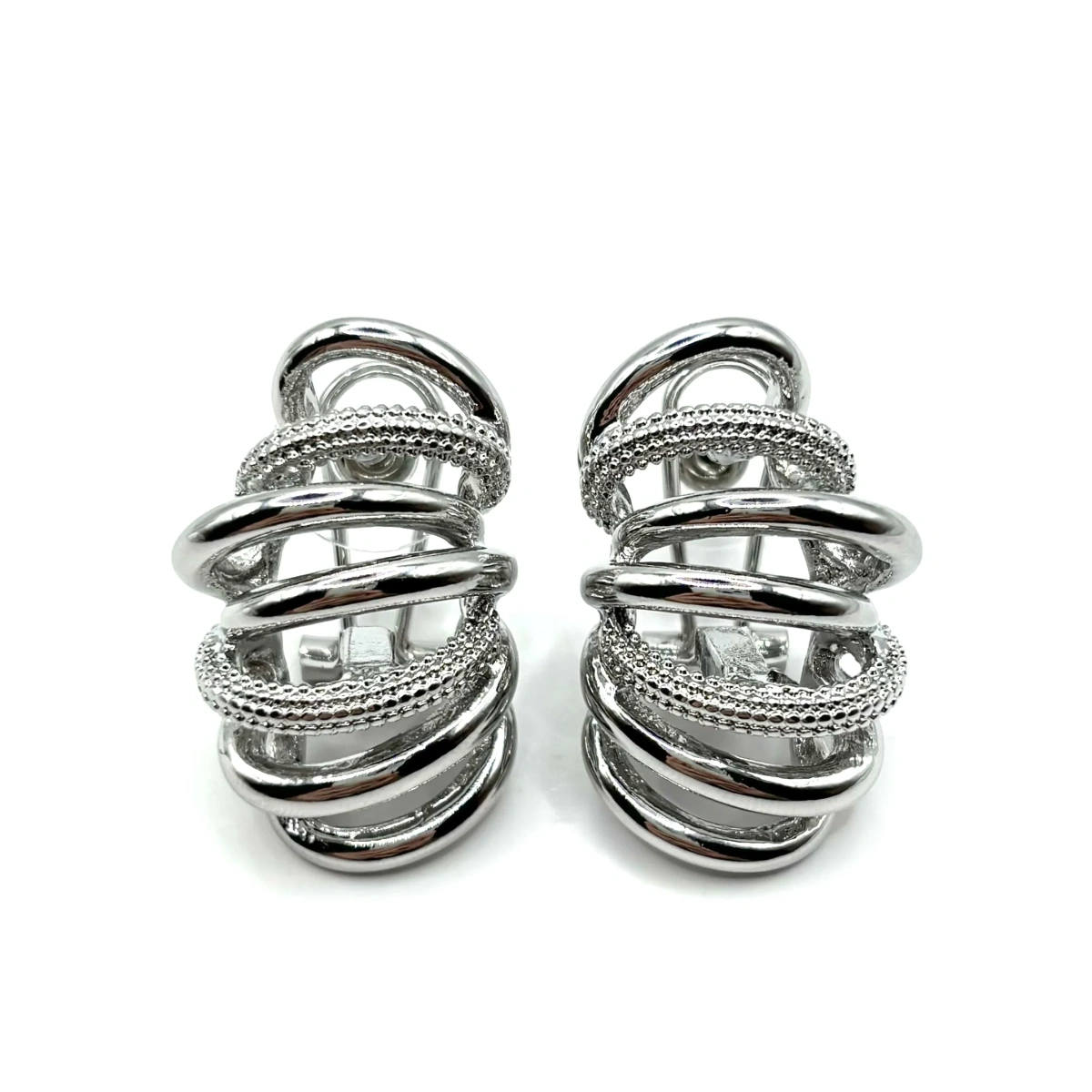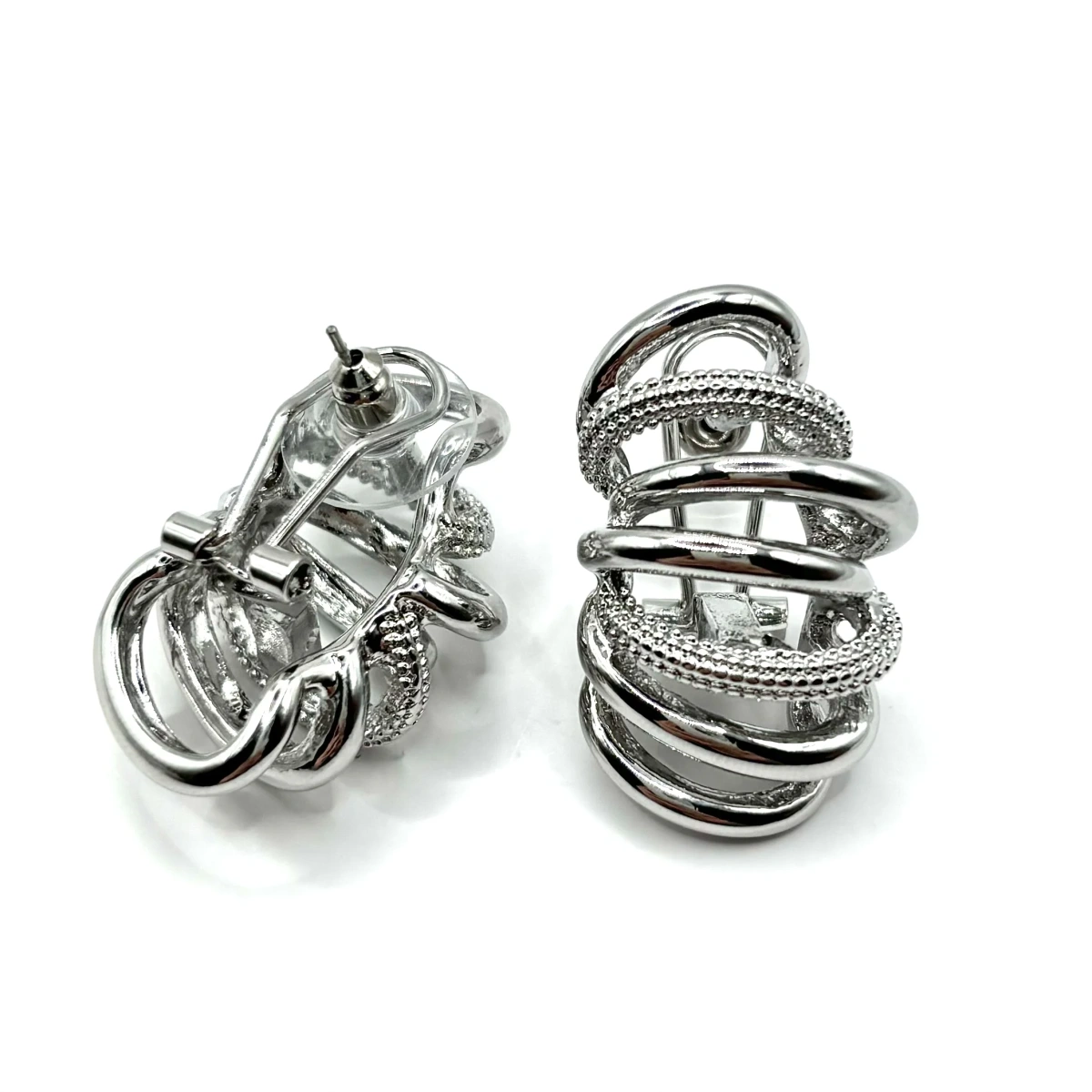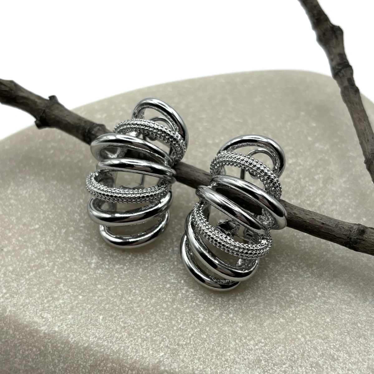 Серьги собраны из нескольких переплетающихся элементов, за счёт чего создаётся ощущение объёма и движения. Они выглядят как многослойная композиция — интересно раскрываются с разных ракурсов.