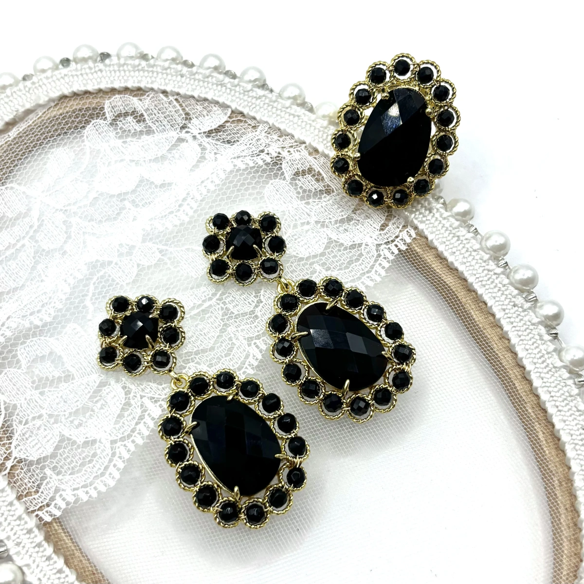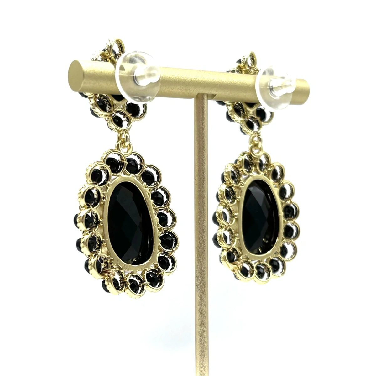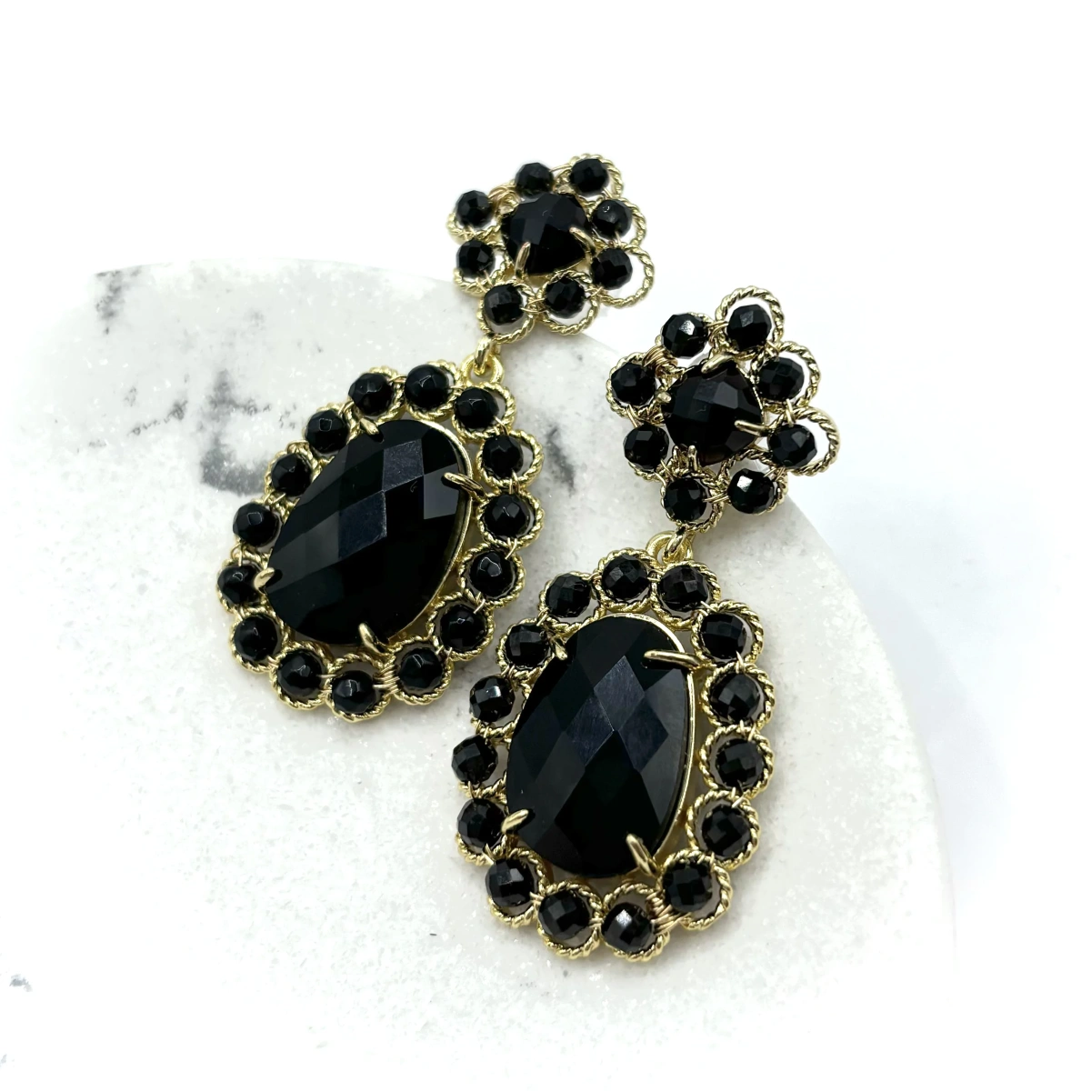 Сочетание чёрного натурального камня и позолоты даёт выразительный контраст — серьги смотрятся ярко, но не кричащe. В них есть лёгкое винтажное настроение, за счёт формы и оправы.