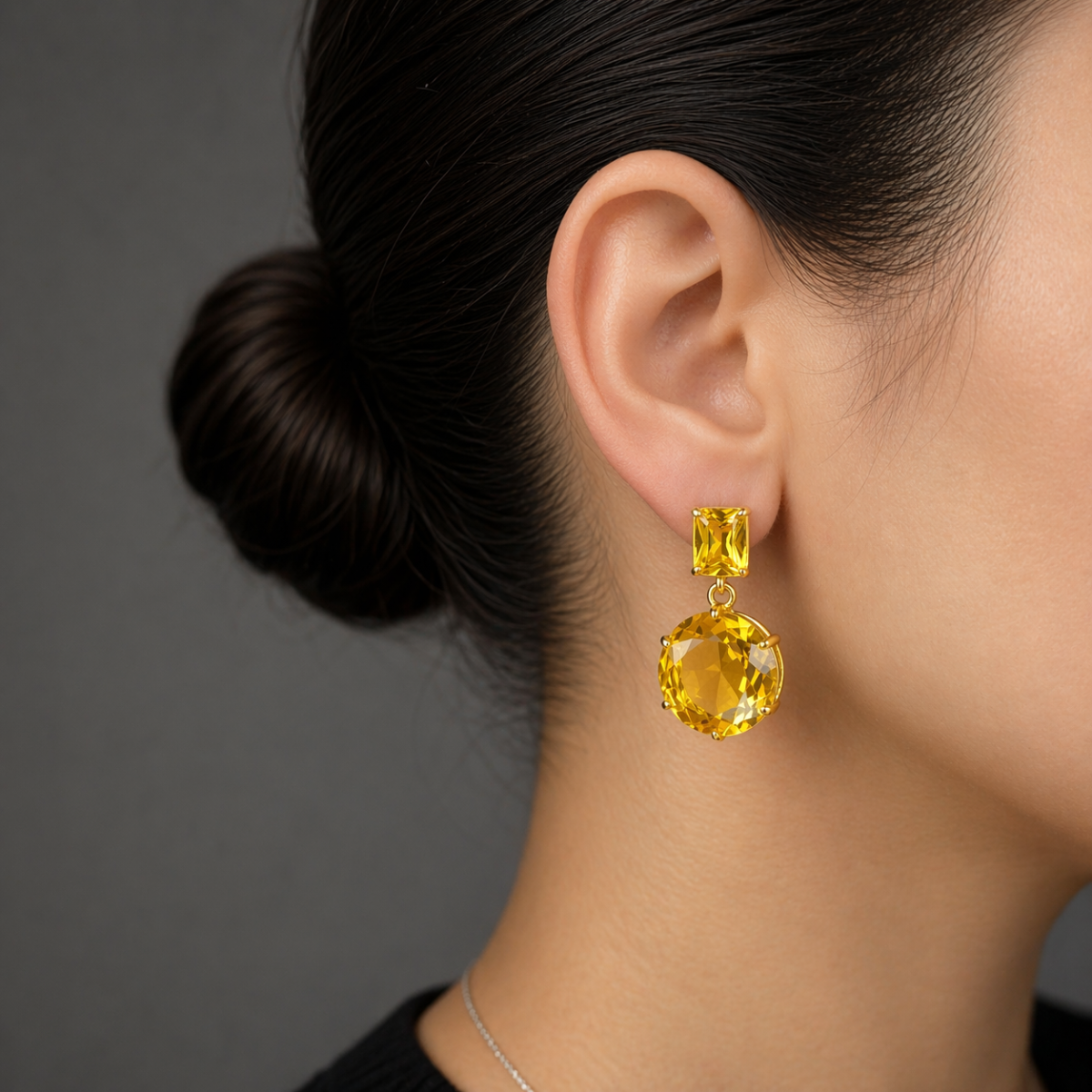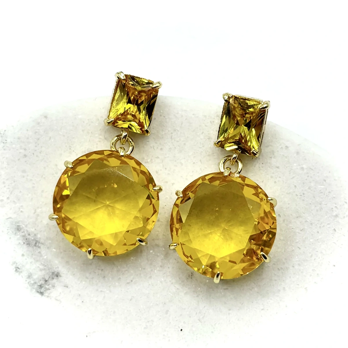 Композиция построена на контрасте форм: сверху — аккуратный прямоугольный камень, снизу — крупный круглый элемент с огранкой. Такая комбинация делает украшение более интересным и визуально вытягивает силуэт.