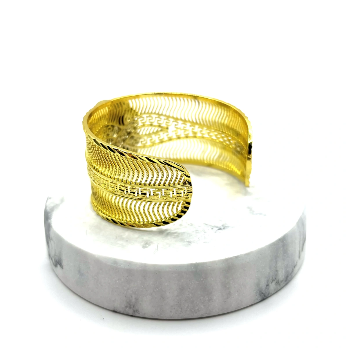 Браслет сразу привлекает внимание за счёт ширины и сложной текстуры. Поверхность украшения украшена рельефным узором, который красиво играет на свету и добавляет глубину.