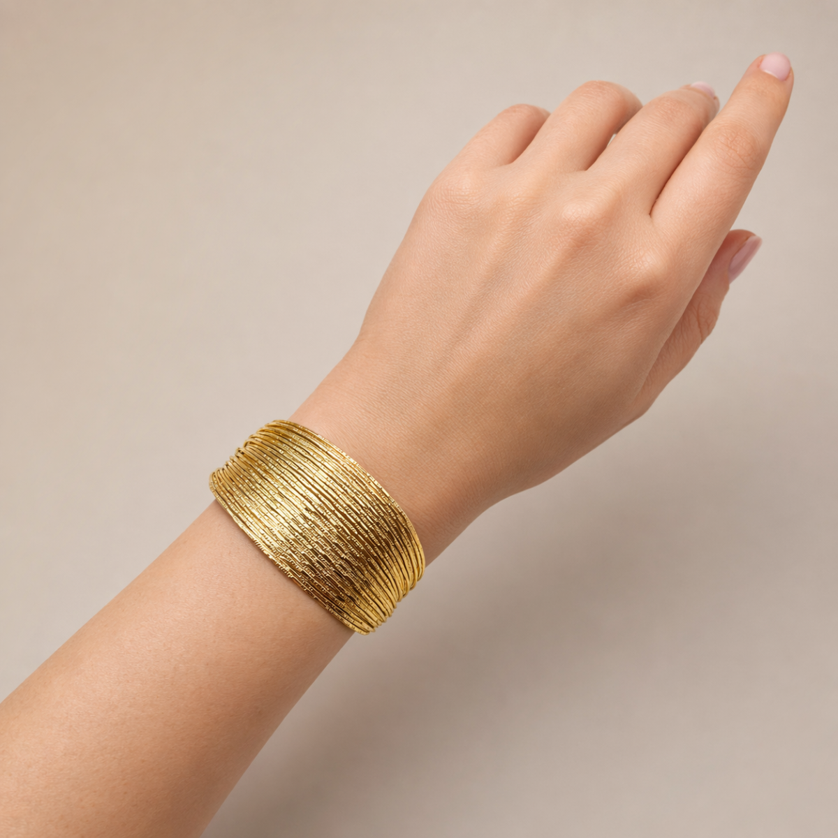 Рельефная поверхность красиво отражает свет, добавляя мягкое сияние и подчёркивая позолоту. Благодаря широкой форме браслет выглядит заметно на руке и может стать главным акцентом образа.