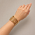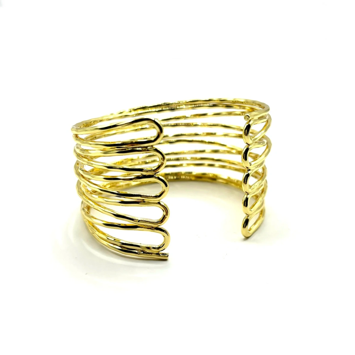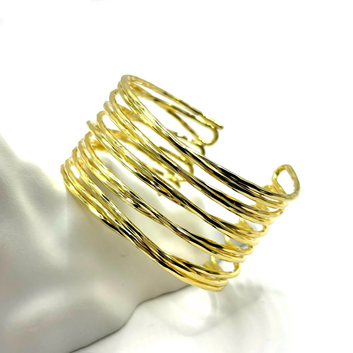 Линии слегка неровные, с мягкой «живой» текстурой — за счёт этого браслет выглядит более современно и интересно, чем классические гладкие модели. При движении он красиво играет на свету и даёт мягкое золотое сияние.