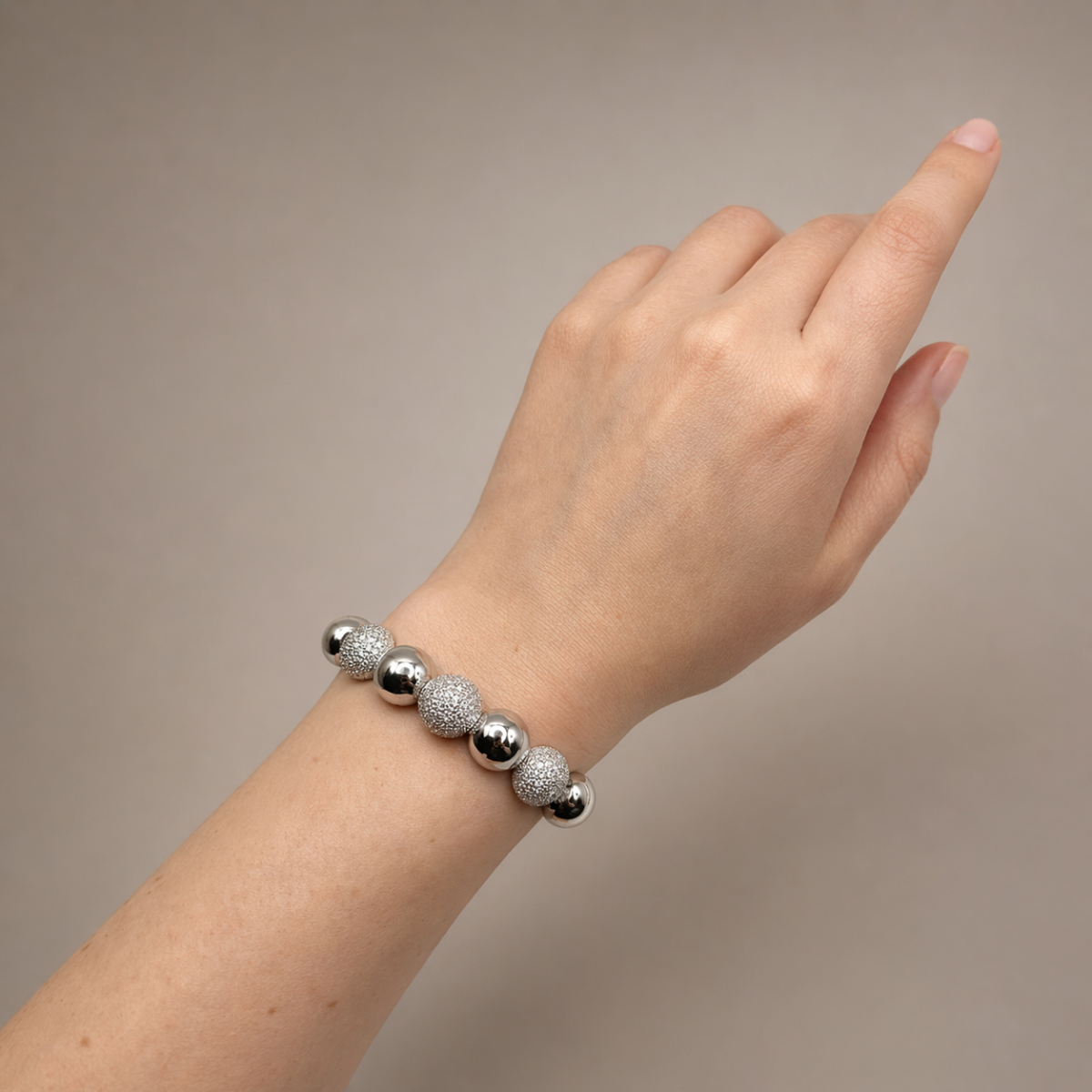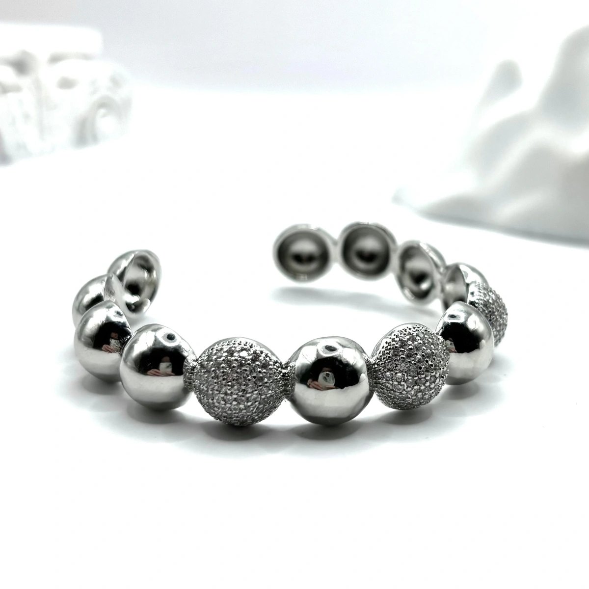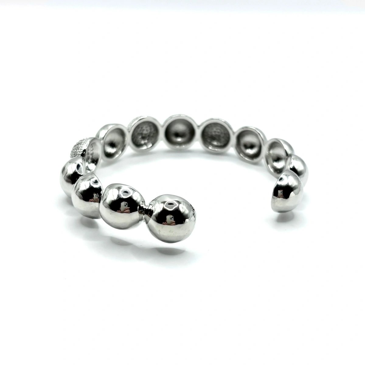Браслет выполнен в виде ряда объёмных полусфер, которые создают чёткий и гармоничный ритм. Гладкие элементы чередуются с инкрустированными фианитами, благодаря чему появляется лёгкое сияние и игра света.