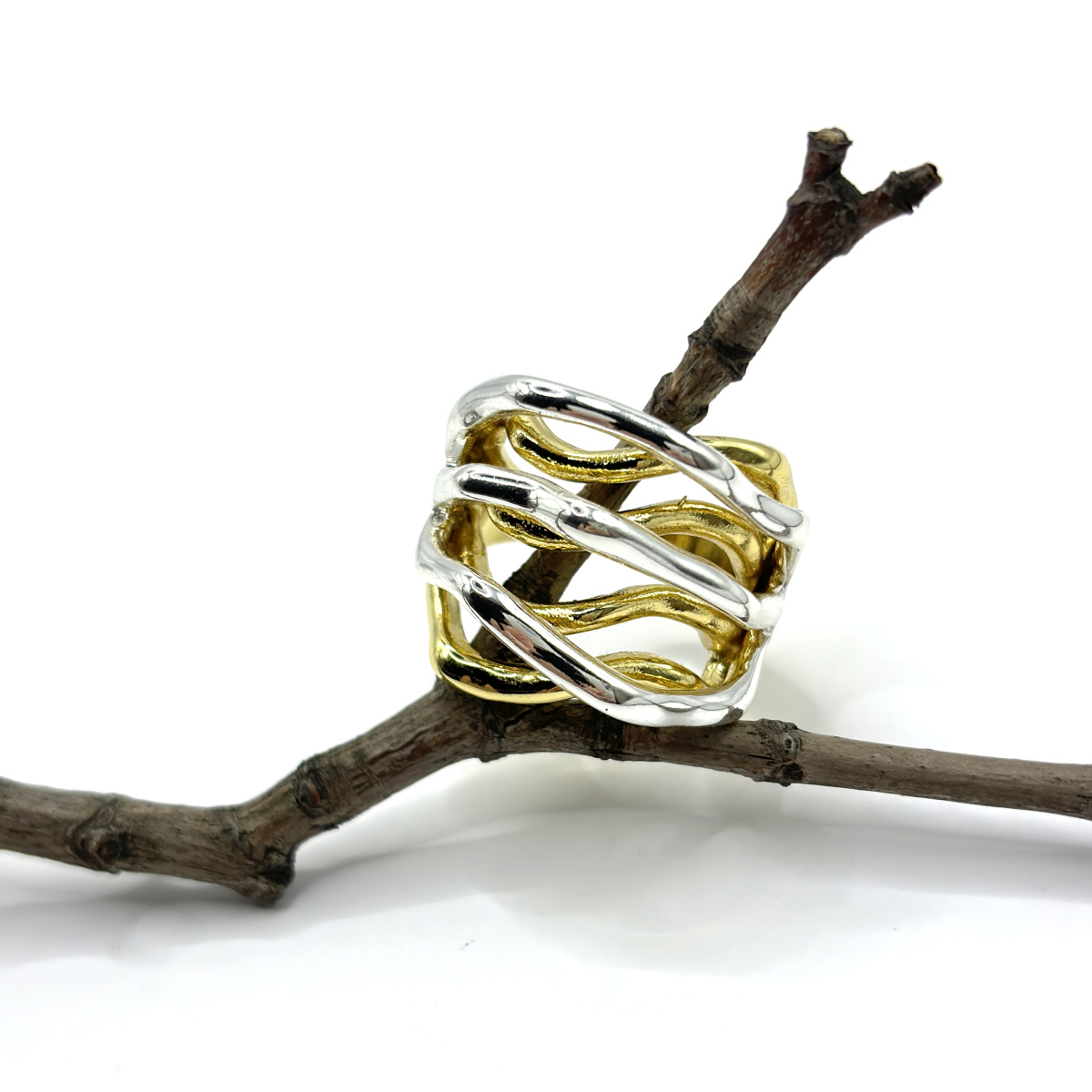 Эффектное кольцо с многослойной конструкцией выполнено в трендовом сочетании двух металлов: тёплого золотого и холодного серебристого оттенков. Переплетающиеся линии создают динамичный, лёгкий и одновременно объёмный дизайн, который выглядит выразительно, но не перегружает образ.