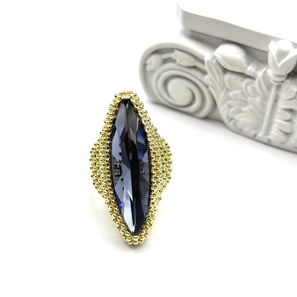 Выразительное кольцо с удлинённым камнем формы «маркиз» привлекает внимание с первого взгляда. Глубокий фиолетовый оттенок кристалла красиво играет на свету благодаря гранёной огранке, создавая насыщенные переливы и визуальную глубину.