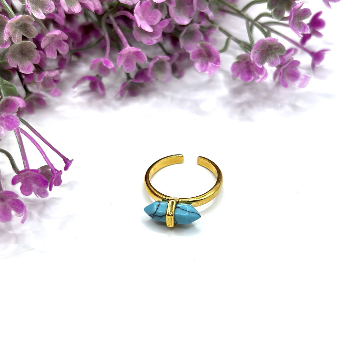 Минималистичное кольцо с камнем турквенит привлекает своим ярким небесно-голубым оттенком с характерным природным рисунком прожилок. Камень выполнен в форме кристалла с аккуратной гранёной поверхностью, что добавляет лёгкое сияние при движении.