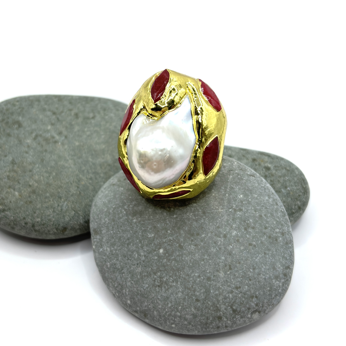 Кольцо выполнено в выразительном художественном стиле: крупный барочный жемчуг с естественной неровной формой становится центральным элементом композиции. Его мягкое перламутровое сияние контрастирует с насыщенными красными вставками кварца, создавая драматичный и запоминающийся образ.